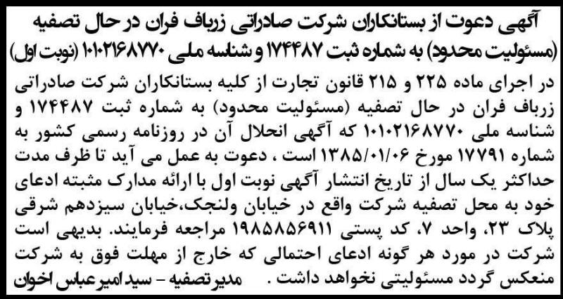 آگهی دعوت از بستانکاران شرکت صادراتی زرباف فران در اجرای ماده قانون تجارت از کلیه بستانکاران شرکت صادراتی زرباف فران در حال تصفیه به شماره ثبت و شناسه ملی که آگهی انحلال آن در روزنامه رسمی کشور به شماره مورخ است دعوت به عمل می اید تا ظرف مدت حداکثر یک سال از تاریخ انتشار آگهی نوبت اول با ارائه مدارک مثبته ادعای خود به محل تصفیه شرکت واقع در خیابان ولنجک مراجعه فرمایند بدیهی است شرکت در مورد هرگونه ادعای احتمالی که خارج از مهلت فوق به شرکت منعکس گردد مسئولیتی نخواهد داشت مدیر تصفیه سید امیر عباس اخوان آگهی دعوت از بستانکاران شرکت صادراتی زرباف فران