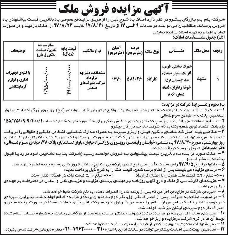 شرکت جام جم بازرگان پیشرو در نظر دارد املاک به شرح ذیل را از طریق مزایده عمومی به بالاترین قیمت پیشنهادی به فروش برساند متقاضیان می توانند در ساعات از تاریخ از املاک بازدید و در صورت تمایل اقدام به تهیه اسناد مزایده نمایند نحوه و شرایط شرکت در مزایده نشانی شهرک صنعتی طوس فاز یک بلوار صنعت آگهی مزایده فروش ملک در روزنامه