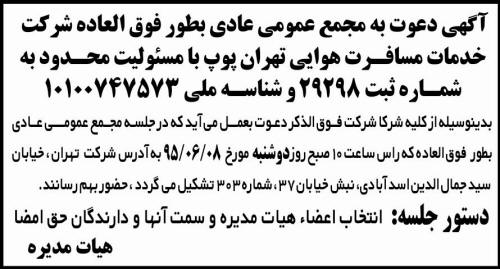 بدینوسیله از کلیه شرکا شرکت فوق الذکر دعوت بعمل می آید که در جلسه مجمع عمومی عادی بطور فوق العاده که راس ساعت 10 صبح روز دوشنبه مورخ به آدرس شرکت تهران خیابان سید جمال الدین اسد آبادی نبش خیابان 37 شماره 303 تشکیل می گردد حضور بهم رسانند - دستور جلسه - انتخاب اعضاء هیات مدیره و سمت آنها و دارندگان حق امضاء - هیات مدیره - شرکت تهران پوپ