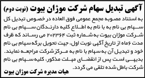 آگهی تبدیل سهام شرکت موژان بیوت ( نوبت دوم )  به استناد مصوبه مجمع عمومی فوق العاده در خصوص تبدیل کل سهام بی نام به با نام به اطلاع کلیه دارندگان سهام بی نام شرکت موژان بیوت به شماره ثبت 202364 می رساند که ظرف مدت 6 ماه از تاریخ این آگهی جهت تحویل برگه سهام بی نام خود و تبدیل آن به سهام با نام به مرکز شرکت مراجعه نمایند بدیهی است پس از انقضای مهلت مذکور کلیه سهام بی نام شرکت باطل شده تلقی می گردد هیات مدیره شرکت موژان بیوت