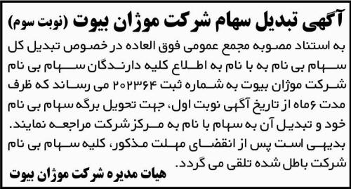 آگهی تبدیل سهام شرکت موژان بیوت ( نوبت سوم )  به استناد مصوبه مجمع عمومی فوق العاده در خصوص تبدیل کل سهام بی نام به با نام به اطلاع کلیه دارندگان سهام بی نام شرکت موژان بیوت به شماره ثبت 202364 می رساند که ظرف مدت 6 ماه از تاریخ این آگهی جهت تحویل برگه سهام بی نام خود و تبدیل آن به سهام با نام به مرکز شرکت مراجعه نمایند بدیهی است پس از انقضای مهلت مذکور کلیه سهام بی نام شرکت باطل شده تلقی می گردد هیات مدیره شرکت موژان بیوت
