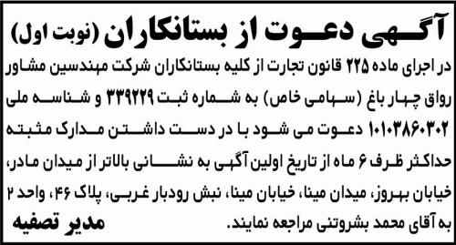 آگهی دعوت از بستانکارن شرکت مهندسین مشاور رواق چهار باغ  مدیر تصفیه  آقای محمد بشروتنی  آگهی دعوت از بستانکاران