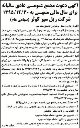 آگهی دعوت مجمع عمومی سالیانه شرکت ریل سیر کوثر - آگهی دعوت مجمع عمومی سالیانه شرکت ریل سیر کوثر - آگهی دعوت مجمع عمومی سالیانه شرکت ریل سیر کوثر