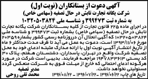 آگهی شرکت یگانه تجارت تابش در حال تصفیه شرکت یگانه تجارت تابش در حال تصفیه سهامی خاص به شماره ثبت و شناسه ملی در اجرای ماده 255 قانون تجارت از کلیه بستانکاران شرکت یگانه تجارت تابش در حال تصفیه که آگهی انحلال آن در روزنامه رسمی کشور بشماره مورخ است دعوت به عمل می آید تا ظرف مدت حداکثر 6 ماه از تاریخ انتشار آگهی نوبت اول با ارائه مدارک مثبته ادعای خود به محل تصفیه شرکت واقع در تهران پاسداران مراجعه فرمایند بدیهی است شرکت در مورد هرگونه ادعای احتمالی که خارج از مهلت فوق به شرکت منعکس گردد مسئولیتی نخواهد داشت مدیر تصفیه محمد تقی روحی