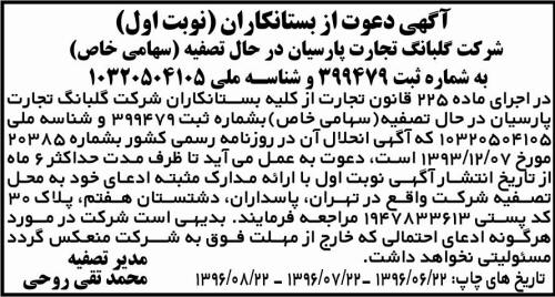 آگهی تصفیه شرکت گلبانگ تجارت پارسیان شرکت گلبانگ تجارت پارسیان در حال تصفیه سهامی خاص به شماره ثبت و شناسه ملی در اجرای ماده 255 قانون تجارت از کلیه بستانکاران شرکت گلبانگ تجارت پارسیان در حال تصفیه که آگهی انحلال آن در روزنامه رسمی کشور بشماره مورخ است دعوت به عمل می آید تا ظرف مدت حداکثر 6 ماه از تاریخ انتشار آگهی نوبت اول با ارائه مدارک مثبته ادعای خود به محل تصفیه شرکت واقع در تهران پاسداران مراجعه فرمایند بدیهی است شرکت در مورد هرگونه ادعای احتمالی که خارج از مهلت فوق به شرکت منعکس گردد مسئولیتی نخواهد داشت - مدیر تصفیه محمد تقی روحی آگهی دعوت از بستانکاران شرکت گلبانگ تجارت پارسیان