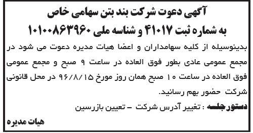 آگهی دعوت شرکت بند بتن  آگهی دعوت شرکت  تغییر آدرس شرکت