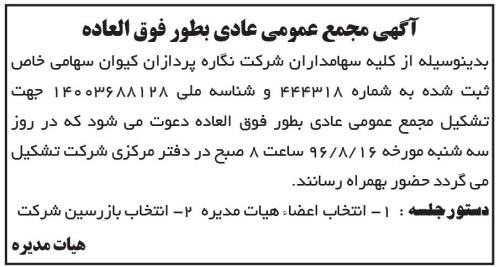آگهی مجمع عمومی عادی بطور فوق العاده  شرکت نگاره پردازان کیوان  دستور جلسه  سهامداران شرکت  انتخاب اعضاء هیات مدیره  انتخاب بازرسین شرکت