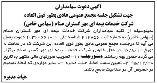 آگهی دعوت سهامداران جهت تشکیل جلسه مجمع عمومی عادی بطور فوق العاده شرکت خدمات بیمه ای مهر گستران صنام سهامی خاص بدینوسیله از کلیه سهامداران شرکت خدمات بیمه ای مهر گستران صنام سهامی خاص به شماره ثبت و شناسه ملی دعوت بعمل می آید تا در جلسه مجمع عمومی عادی بطور فوق العاده این شرکت که در ساعت 8 مورخ در محل قانونی شرکت خدمات بیمه ای مهر گستر صنام برگزار می گردد حضور بهم رسانند - دستور جلسه - تصویب صورتهای مالی منتهی به تاریخ - تعیین سمت اعضاء هیات مدیره - سایر مواردی که اتخاذ تصمیم درخصوص آن در صلاحیت مجمع باشد - هیات مدیره - آگهی دعوت سهامداران