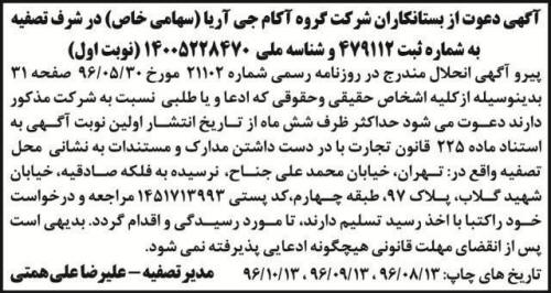 آگهی تصفیه شرکت گروه آکام جی آریا - آگهی تصفیه شرکت گروه آکام جی آریا - آگهی تصفیه شرکت گروه آکام جی آریا - آگهی تصفیه شرکت گروه آکام جی آریا - آگهی تصفیه شرکت گروه آکام جی آریا