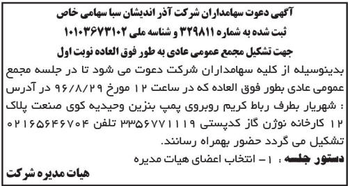 آگهی دعوت سهامداران شرکت آذر اندیشان سبا