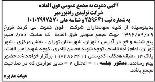 آگهی دعوت به مجمع عمومی فوق العاده شرکت تولیدی رادپور