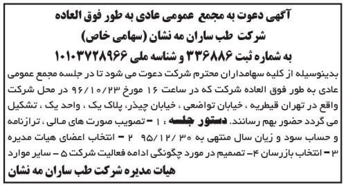 آگهی دعوت به مجمع عمومی عادی به طور فوق العاده شرکت طب ساران مه نشان (سهامی خاص) به شماره ثبت 336886 و شناسه ملی 10103728966 بدینوسیله از کلیه سهامداران محترم شرکت دعوت می شود تا در جلسه مجمع عمومی عادی به طور فوق العاده شرکت که در ساعت 16 مورخ 23/10/96 در محل شرکت واقع در تهران قیطریه ، خیابان تواضعی ، خیابان چیذر پلاک یک  واحد یک ،تشکیل می گردد حضور بهم رسانند دستور جلسه تصویب صورت های مـالی ، ترازنامه و حساب سود و زیان سال منتهی به 2 – انتخاب اعضای هیات مدیره 3– انتخاب بازرسان 4- تصمیم در مورد چگونگی ادامه فعالیت شرکت 5 - سایر موارد هیات مدیره شرکت طب ساران مه نشان