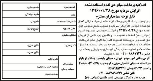 اطلاعیه پرداخت مبلغ حق تقدم استفاده نشده افزایش سرمایه مورخ قابل توجه سهامداران - بدینوسیله به اطلاع می رساند آن دسته از سهامدارانی که از حق تقدم خود در افزایش سرمایه مصوب مجمع عمومی فوق العاده مورخ شرکت مهندسی نصیر ماشین سهامی عام استفاده ننموده اند به دلیل عدم دریافت مشخصات خواهشمند است هر چه سریعتر نسبت به ارسال مشخصات و شماره حساب بانکی خود طبق جدول زیر به شماره فکس اقدام نمایند - آدرس و تلفن امور سهام تهران خیابان ولیعصر بالاتر از بلوار میرداماد - تلفن تماس شرکت مهندسی نصیر ماشین - هیات مدیره