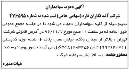 آگهی دعوت سهامداران شرکت آتیه نگاران قاره