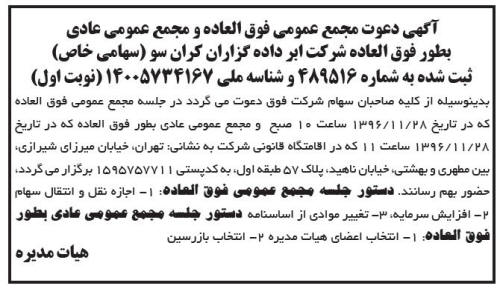 بدینوسیله از کلیه صاحبان سهام شرکت فوق دعوت می گردد در جلسه مجمع عمومی فوق العاده که در تاریخ ساعت صبح و مجمع عمومی عادی بطور فوق العاده که در تاریخ ساعت که در اقامتگاه قانونی شرکت به نشانی تهران خیابان میرزای شیرازی بین مطهری و بهشتی خیابان ناهید برگزار می گردد حضور بهم رسانند - دستور جلسه مجمع عمومی فوق العاده - اجازه نقل و انتقال سهام - افزایش سرمایه - تغییر موادی از اساسنامه - دستور جلسه مجمع عمومی عادی بطور فوق العاده - انتخاب اعضای هیات مدیره - انتخاب بازرسین - هیات مدیره - شرکت ابر داده گزاران کران سو