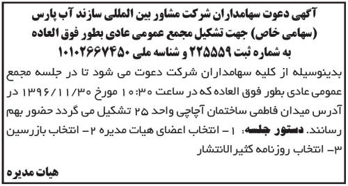 بدینوسیله از کلیه سهامداران شرکت دعوت می شود تا در جلسه مجمع عمومی عادی بطور فوق العاده که در ساعت مورخ در آدرس میدان فاطمی ساختمان آچاچی تشکیل می گردد حضور بهم رسانند - دستور جلسه انتخاب اعضای هیات مدیره - انتخاب اعضای بازرسین - انتخاب روزنامه کثیرالانتشار - هیات مدیره - آگهی دعوت سهامداران شرکت بین المللی سازند آب پارس جهت تشکیل مجمع عمومی عادی بطور فوق العاده به شماره ثبت و شناسه ملی