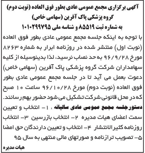 آگهی مجمع عمومی گروه پزشکی پاک آفرین با توجه به اینکه جلسه مجمع عمومی عادی بطور فوق العاده نوبت اول منتشر شده در روزنامه ابرار به شماره مورخ به حد نصاب نرسید لذا بدینوسیله از کلیه سهامداران شرکت گروه پزشکی پاک آفرین دعوت به عمل می آید تا در جلسه مجمع عمومی عادی بطور فوق العاده نوبت دوم مورخ ساعت صبح که در محل قانونی شرکت تشکیل می شود حضور بهم رسانند دستور جلسه مجمع عمومی عادی آگهی مجمع عمومی گروه پزشکی پاک آفرین
