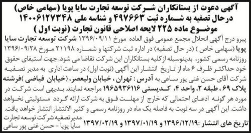 آگهی دعوت از بستانکاران شرکت توسعه تجارت سایا پویا