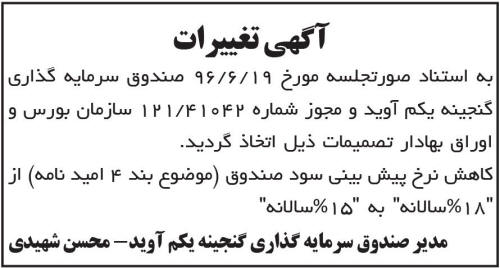 آگهی تغییرات چاپ شده در روزنامه ابرار  کاهش نرخ پیش بینی سود صندوق  مدیر صندوق سرمایه گذاری گنجینه یکم آوید