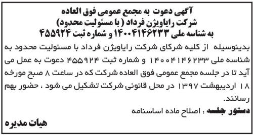 آگهی دعوت به مجمع عمومی فوق العاده شرکت رایاویژن فرداد - بدینوسیله از کلیه شرکای شرکت رایاویژن فرداد با مسئولیت محدود به شناسه ملی و شماره ثبت دعوت به عمل می آید تا در جلسه مجمع عمومی فوق العاده شرکت که در ساعت صبح مورخه اردیبهشت در محل قانونی شرکت تشکیل می شود حضور بهم رسانند - دستور جلسه اصلاح ماده اساسنامه - هیات مدیره - آگهی دعوت به مجمع شرکت رایاویژن فرداد