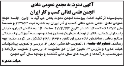 آگهی دعوت به مجمع انجمن تعالی کسب و کار ایران  مجمع عمومی عادی  آگهی دعوت به مجمع  تصویب ترازنامه و صورتحساب درآمدها