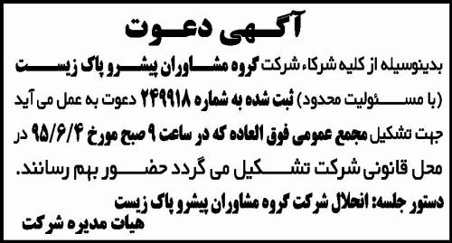آگهی دعوت  شرکت گروه مشاوران پیشرو پاک زیست  تشکیل مجمع عمومی فوق العاده  هیات مدیره شرکت  انحلال شرکت