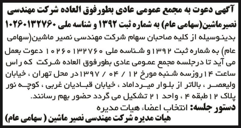 آگهی دعوت به مجمع عمومی عادی بطور فوق العاده شرکت مهندسی نصیر ماشین به شماره ثبت و شناسه ملی - بدینوسیله از کلیه صاحبان سهام شرکت مهندسی نصیر ماشین به شماره ثبت و شناسه ملی دعوت بعمل می آید تا در جلسه مجمع عمومی عادی بطور فوق العاده شرکت که راس ساعت روز سه شنبه مورخ در محل تهران خیابان ولیعصر بالاتر از بلوار میرداماد تشکیل می گردد حضور بهم رسانند - دستور جلسه انتخاب اعضاء هیات مدیره - هیات مدیره شرکت مهندسی نصیر ماشین - آگهی مجمع شرکت نصیر ماشین