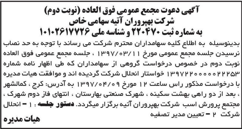 بدینوسیله به اطلاع کلیه سهامداران محترم شرکت می رساند با توجه به حد نصاب نرسیدن جلسه مجمع عمومی مورخ جلسه مجمع عمومی فوق العاده نوبت دوم در خصوص درخواست گروهی از سهامداران که طی اظهارنامه شماره خواستار انحلال شرکت گردیده اند و موافقت هیات مدیره با درخواست مذکور راس ساعت به آدرس کرج شرکت بهپروران آتیه برگزار می گردد - دستور جلسه انحلال شرکت - تعیین مدیر تصفیه - هیات مدیره - آگهی مجمع عمومی فوق العاده در روزنامه ابرار