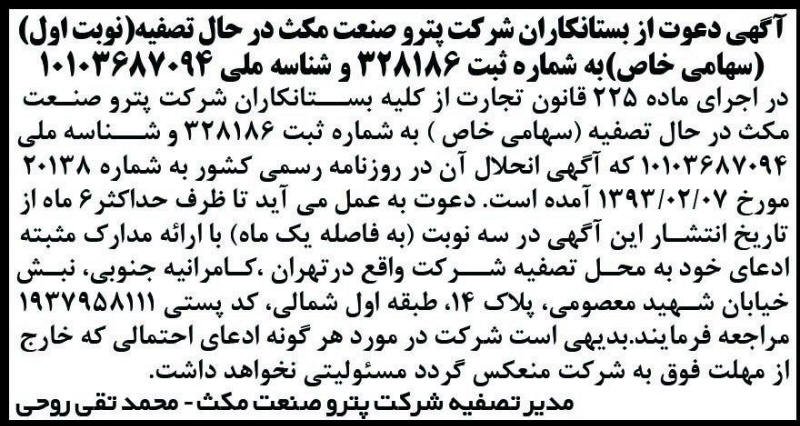 در اجرای ماده قانون تجارت از کلیه بستانکاران شرکت پترو صنعت مکث در حال تصفیه به شماره ثبت و شناسه ملی که آگهی انحلال آن در روزنامه رسمی کشور به شماره مورخ آمده است دعوت به عمل می آید تا ظرف حداکثر شش ماه از تاریخ انتشار این آگهی در سه نوبت با ارائه مدارک مثبته ادعای خود به محل تصفیه شرکت واقع در تهران مراجعه فرمایید - بدیهی است شرکت در مورد هرگونه ادعای احتمالی که خارج از مهلت فوق به شرکت منعکس گردد مسئولیتی نخواهد داشت - مدیر تصفیه شرکت پترو صنعت مکث - محمد تقی روحی