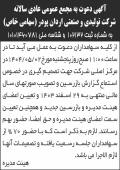 روزنامه ابرار آگهی مجمع سالانه شرکت تولیدی و صنعتی اردان